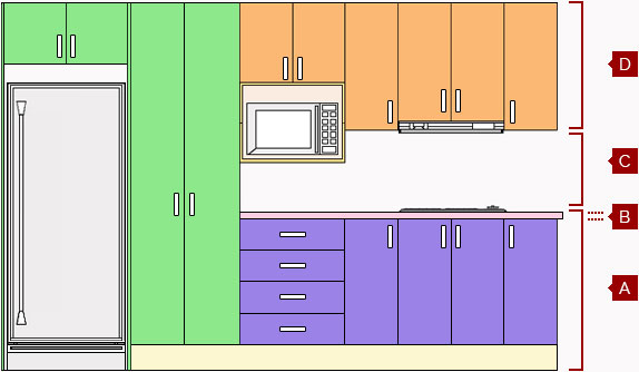 * Wall cabinets can generally be any height, however the finished height would normally align with the tip of the tall cabinets as shown in the diagram. The Tall cabinet height will therefore be calculated based on this principal.